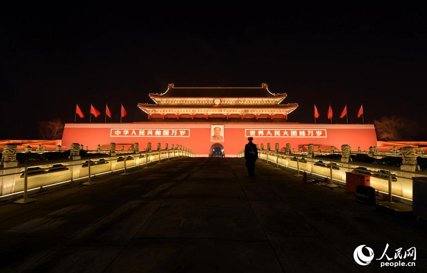 图2014年3月3日6时46分,北京,国旗护卫队向天安门广场走来准备升旗。当日15时,全国政协十二届二次会议将在人民大会堂开幕,中国正式进入两会时间。