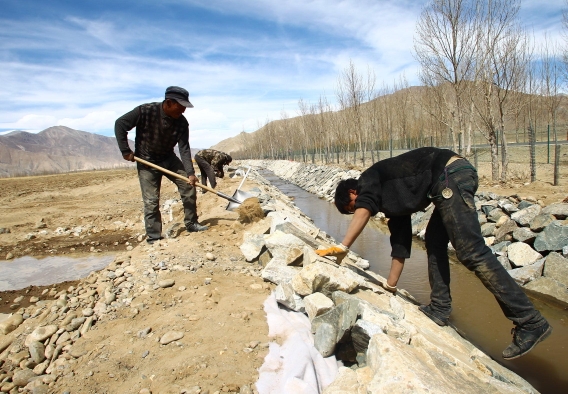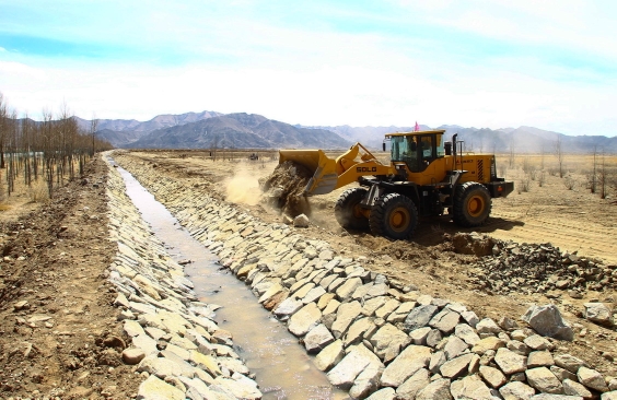 当日,西藏日喀则地区南木林县天气晴好,雅鲁藏布江北岸各种大型机械纷纷出动,投入到运土、挖沟、修渠等施工中。据悉,由山东潍坊援藏工作组于2011年6月启动的雅江北岸综合生态示范区工程目前已完成投资3000余万元,让8800余亩荒滩地变成了牧草场和良田。