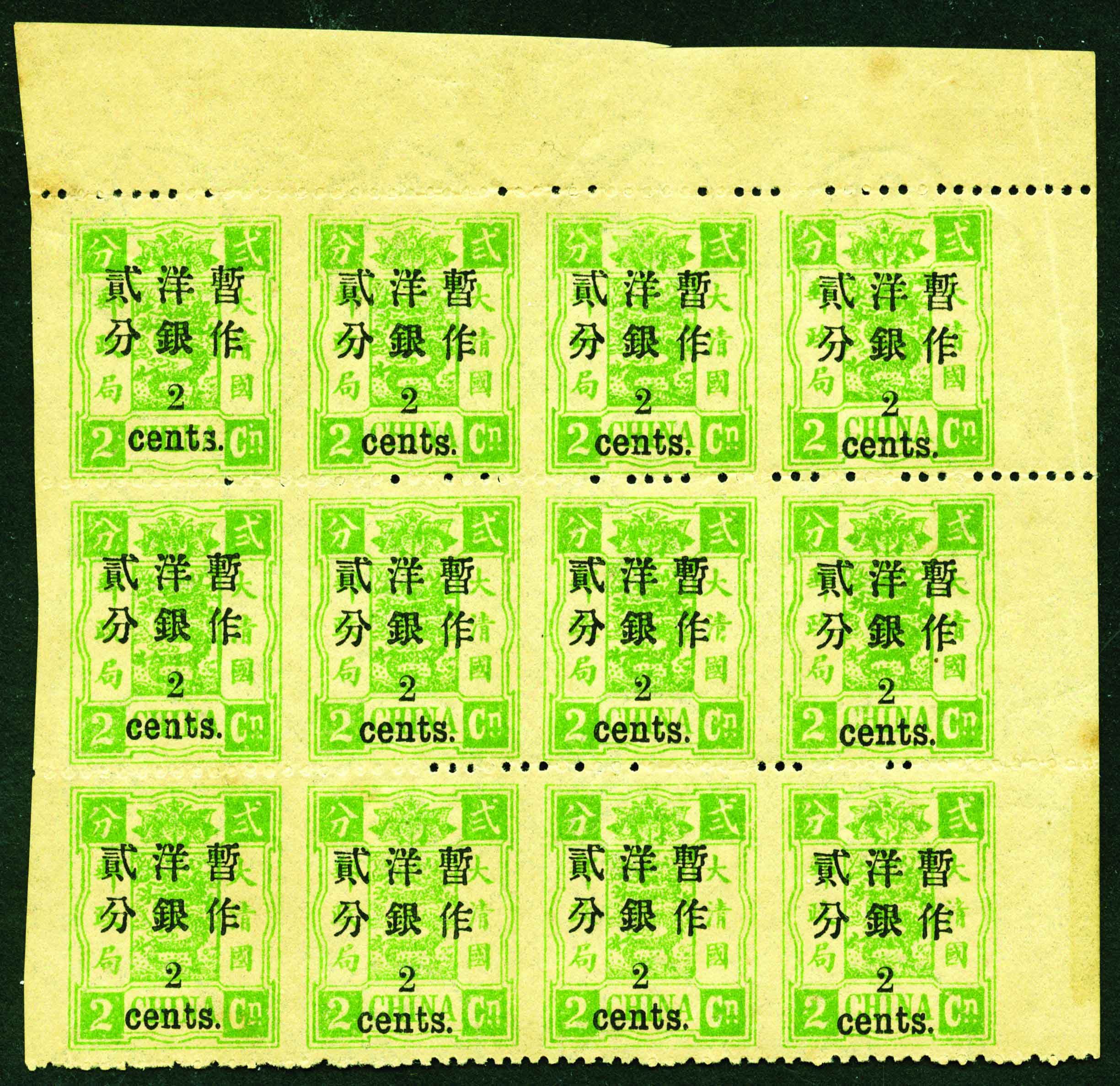 另一焦点拍品是1897年慈禧小字改值洋银2分于貮分中缝漏齿十二方连,附三纸边,成交价为69万港元,是现知存世同类错体票中最大方连之一件,颜色鲜艳并附原胶。