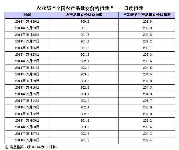 新华食品6月3日电 据农业部“全国农产品批发市场信息网”监测:2014年05月30日,农产品批发价格总指数是 200.8(以2000 年为100),“菜篮子”产品批发价格指数是 201.8(以2000年为100)。