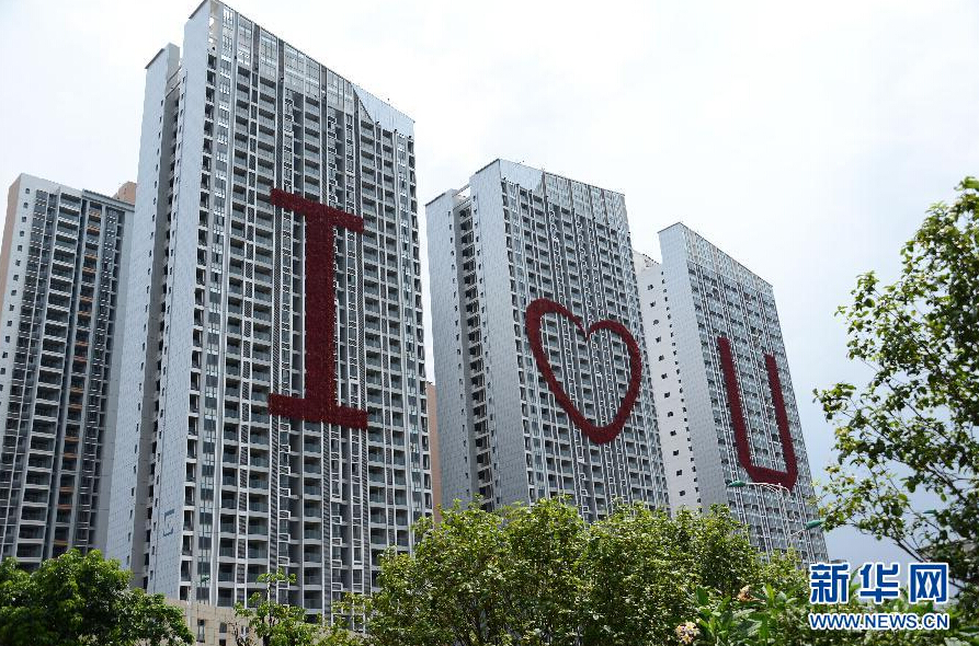 8月7日在南宁拍摄的“楼体情书” 近日,广西南宁市三座新建楼房上出现巨型的“I”“U”和“心”形字样,吸引了公众的眼球,成为当地情侣表白心意的时尚之地。 新华社发