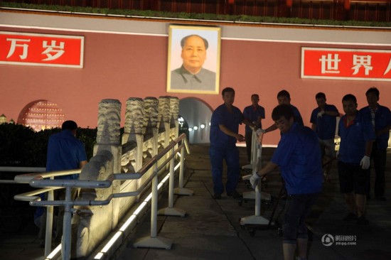 在天安门地区,目前,只有天安门前金水桥上的7座护栏还是传统的白色护栏。此次更换后,天安门地区设施整体风格将更加和谐统一,以迎接新中国成立65周年。图为施工人员在金水桥上拆除原有的白色护栏。陈健男/摄