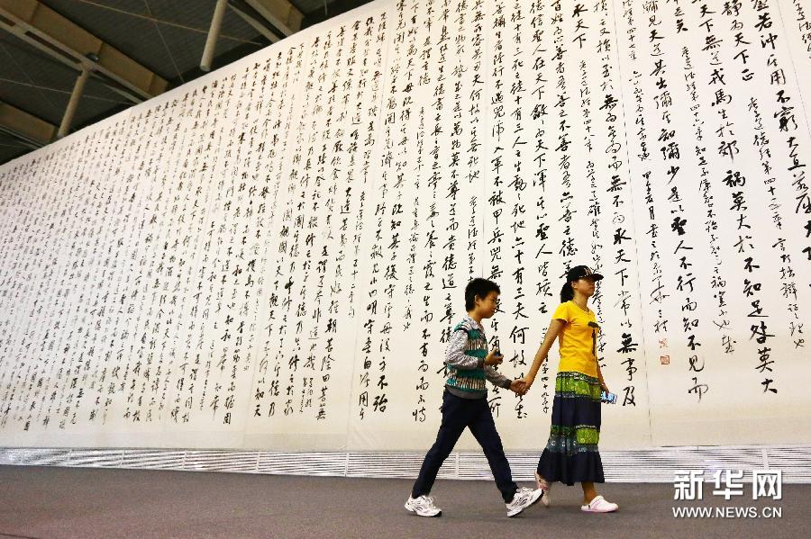 8月18日,观众经过雒三桂书写的长100米、高10米的书法作品《道德经》。
