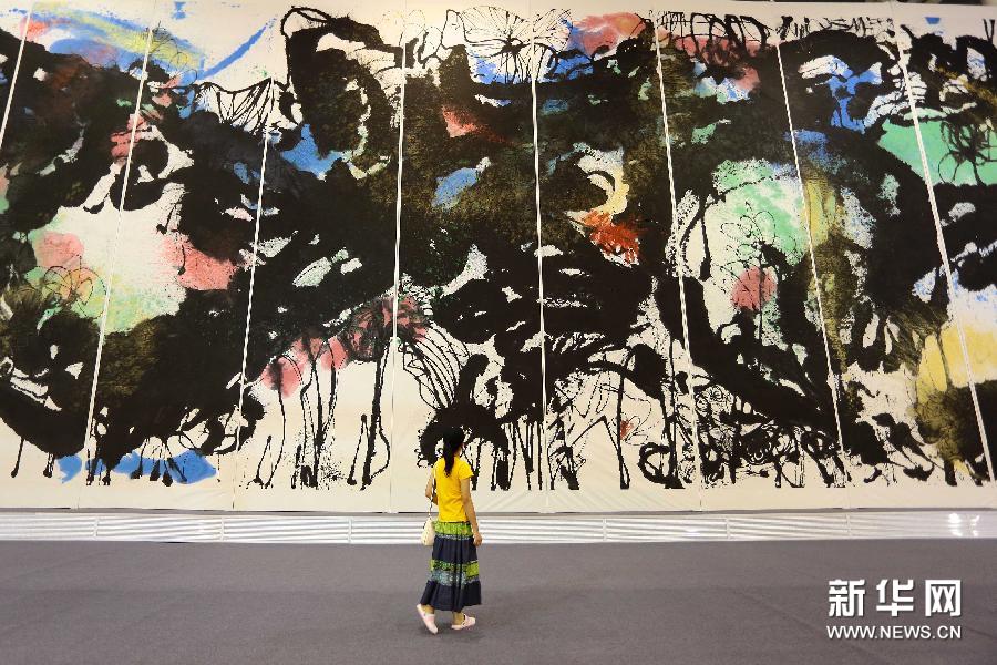 8月18日,一名观众观看崔自默创作的巨幅国画《大好荷山》。