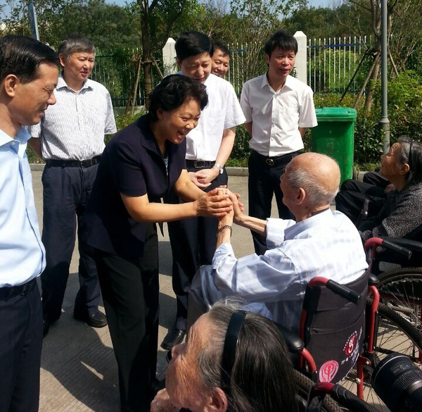 针对老龄人口增长速度快,比例高,养老资源缺乏的现实问题,9月3日到4日,浙江省政协就“建立完善养老服务体系加快发展老年服务产业”,在浙江省台州市开展调研。 图为浙江省政协主席乔传秀在台州市椒江区社会福利院看望老人。鲍蔓华摄影/文