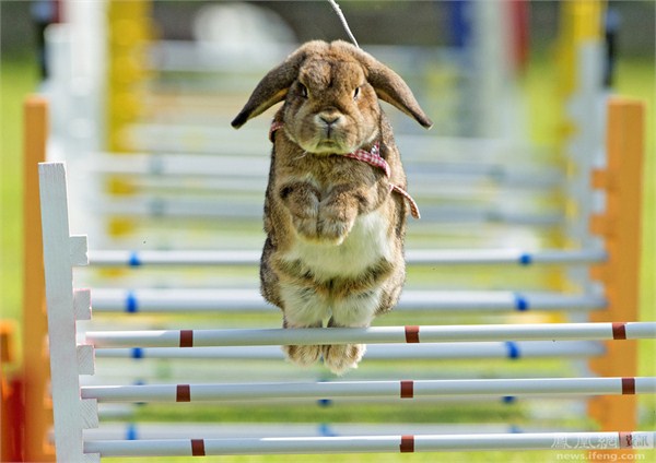 跨栏也是要分等级的,这只兔子跨越的就是四层的栏杆。参赛的兔子表情似乎相当认真。