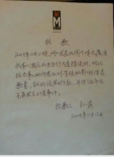 2014年10月10日晚,网上发表的图片情况属实,我本人酒后的失当行为是错误的,对此给当事人的伤害和对学校的影响深表歉意,就此说声对不起,并保证今后不再发生此类事件。