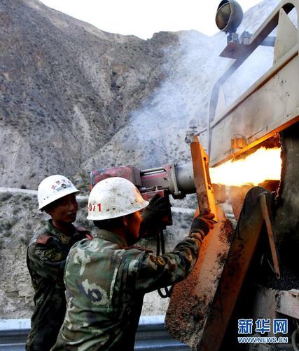 武警交通二支队官兵在国道318线川藏公路上的险途“怒江72道拐”路段破损路面修复现场操作沥青混凝土拌合机(10月19日摄)。目前,正值川藏公路塌方、滚石、干塌、路基垮塌等灾害多发季节。10月18日下午“怒江72道拐”多处不同程度发生干塌灾害,部分路面遭到破坏。负责这一路段养护的武警交通二支队官兵迅速赶到现场,清理山石并铺设沥青修复路面。据介绍,武警交通二支队驻守在川藏公路沿线,主要担负海拔最高、灾害最频繁、路况最险的800公里路段养护保通任务,养护管理路段跨越金沙江、澜沧江、怒江、帕隆藏布江等4大水系,翻越宗拉山、拉乌山、东达山等6座雪山,年平均各类自然灾害多达300多次,被称之为“世界公路病害百科全书”。多年来,武警交通二支队官兵用青春、汗水,乃至生命诠释着“一不怕苦、二不怕死”的“两路”精神,使川藏公路通车时间由1996年以前的不足半年,达到了现在的11个月以上,行车时速平均提高了40倍,创造了连续17年冬季无断通的奇迹。新华社记者 潘旭 摄