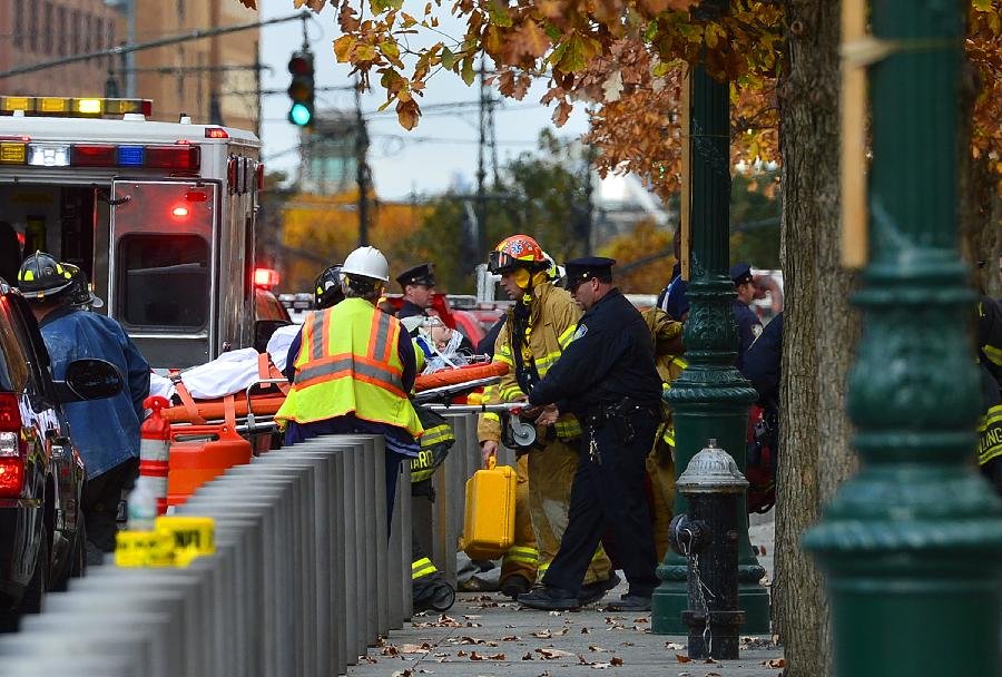 11月12日,在纽约世贸中心一号楼旁,救援人员将获救工人送上救护车。当日,两名正在纽约世贸中心一号楼进行高空清洗作业的工人因绳索故障被困于69层楼窗外高空。经警方和消防人员救援,两名工人成功获救。刚于本月初投入商业运营的纽约世贸中心一号楼共104层,高约540米。受该突发事件影响,世贸中心遗址临时对游客关闭。新华社记者王雷摄
