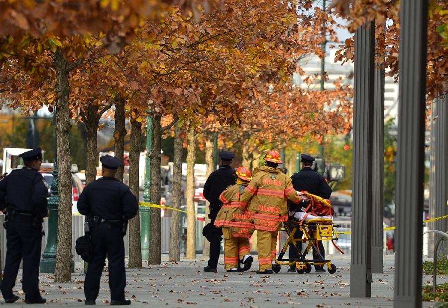 11月12日,在纽约世贸中心一号楼旁,救援人员将获救工人送上救护车。当日,两名正在纽约世贸中心一号楼进行高空清洗作业的工人因绳索故障被困于69层楼窗外高空。经警方和消防人员救援,两名工人成功获救。刚于本月初投入商业运营的纽约世贸中心一号楼共104层,高约540米。受该突发事件影响,世贸中心遗址临时对游客关闭。新华社记者王雷摄