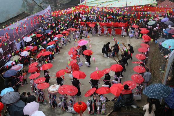 11月17日,贵州省黎平县平寨举行斗牛活动,欢庆牯藏节。当地苗族同胞身着节日盛装,载歌载舞,热闹非凡。据悉,牯藏节是苗族同胞最为古老而隆重的传统节日。苗语称“努间”或“努凤农”,相传始于三国时期。诸葛亮在征服南疆的过程中,发现苗族先民有喝酒、吹芦笙、斗牛、唱歌跳舞的喜好,于是用“斗牛—吃牯藏—庆丰收”来对苗族先民加以引导和规范,代代相传沿袭至今。节日期间,斗牛、吹芦笙、踩堂等丰富多彩的活动,将原汁原味的民族风情展现得淋漓尽致。图为踩堂表演。周志光 罗永明 摄