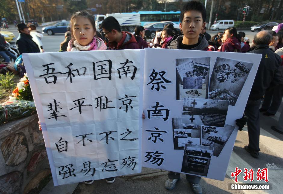 12月13日,中学生在南京大屠杀遇难同胞北极阁丛葬地悼念遇难同胞。当日是中国首个国家公祭日。77年前的12月13日,侵华日军攻占中国南京,在此后的一个多月时间里,血腥屠杀30多万中国人,制造了震惊中外的南京大屠杀事件。中新社发 泱波 摄