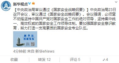 中新网1月23日电 据新华社微博“新华视点”消息,中央政治局23日召开会议,审议通过《国家安全战略纲要》。会议强调,必须毫不动摇坚持中国共产党对国家安全工作的绝对领导,坚持集中统一、高效权威的国家安全工作领导体制。要加强国家安全意识教育,努力打造一支高素质的国家安全专业队伍。