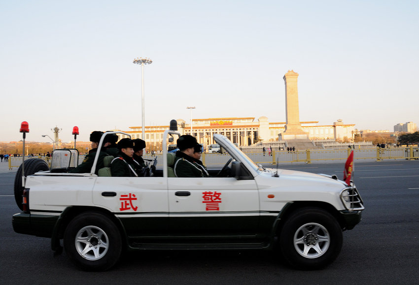 2015年02月26日,北京,特警、武警及公安的巡逻车加强天安门广场周边的巡逻执勤工作,确保全国两会顺利召开。杜佳/CFP