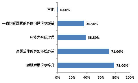 调查显示,同样的,人们在考虑使用健康寝具最希望能给健康带来的变化时,多数人仍选择了提高睡眠质量、清醒后感觉更加轻松等功能,而希望通过健康寝具的使用能够提高免疫力、缓解一直饱受困扰的身体问题的人们相比则较少。