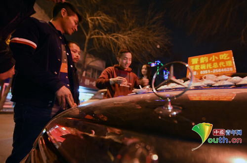 2015年3月18日晚8时许,两辆“大奔”并排停在太原市太原理工大学门外,“大奔”的前机盖上摆满了山西特色小吃“碗秃”,几名年轻人不时在车前叫卖。来往的行人纷纷驻足围观,偶尔也有人上前购买品尝。摊主小周说:“今天是第一天在这摆摊,看的人多,买的人少,一晚上只卖出去三十多碗,不过天气暖和了,开车出来摆摊挣个油钱,和朋友聚聚,卖多卖少无所谓。”