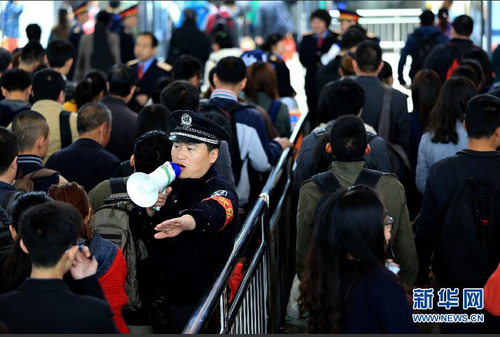 4月6日,在山西运城北站,一位铁路执勤民警在候车厅疏导旅客进站检票。当日是2015年清明小长假最后一天,全国各地铁路、公路系统迎来返程客流高峰。 新华社发(鲍东升 摄)