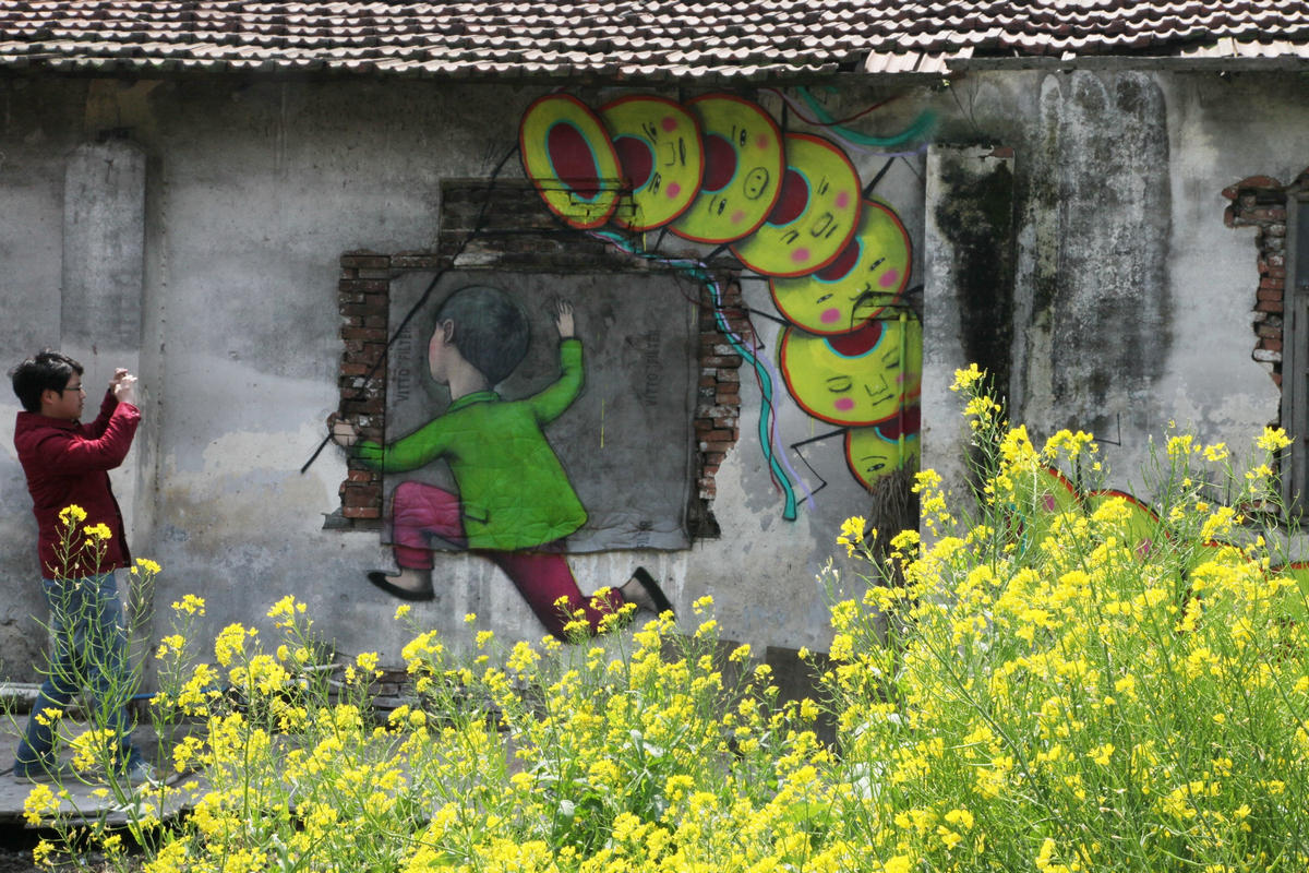 4月13日,法国艺术家马兰的4幅“江南版”涂鸦作品亮相上海市金山区枫泾古镇,这些涂鸦作品描绘出简单生动的本土化人物形象。作为一项公益活动,这是马兰首次在中国乡村田头创作涂鸦作品,共计10幅。新华社发(庄毅摄)