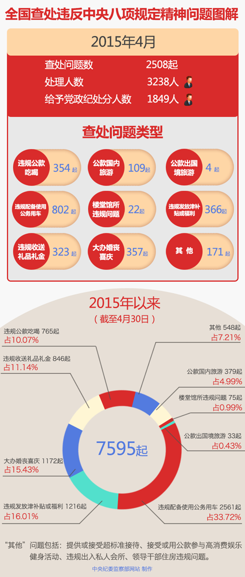 中新网5月18日电 据中央纪委监察部网站消息,为掌握全国贯彻落实八项规定精神情况,中央纪委在31个省区市和新疆生产建设兵团、59个中央和国家机关建立了落实中央八项规定精神情况月报制度。据通报,截至4月30日,2015年4月全国查处违反中央八项规定精神问题2508起。