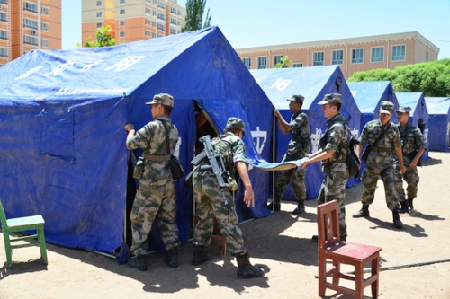 7月3日,兰州军区救援官兵在新疆皮山县地震灾区为受灾群众搭建帐篷。