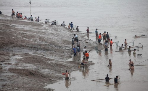 河南三门峡大坝泄洪 黄河两岸又现捞鱼大军