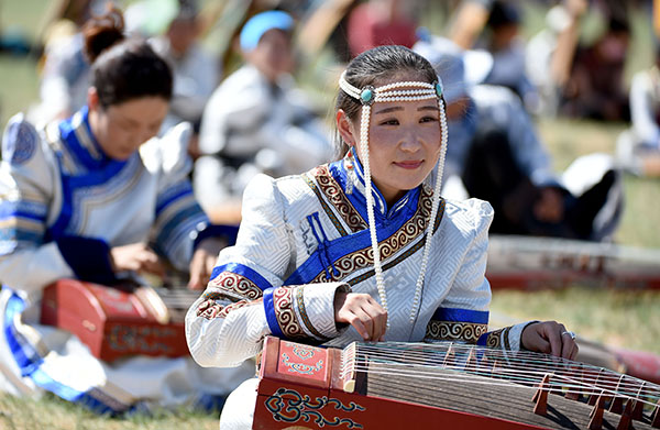 蒙古族姑娘在开幕式上表演蒙古筝。