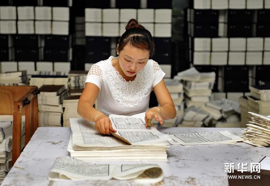 8月2日,河北吴桥金鼎古籍印刷厂的工人在进行线装书的折页工序。