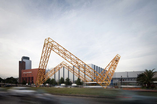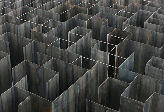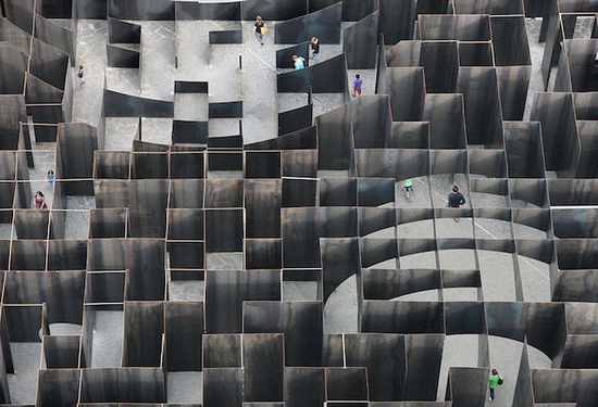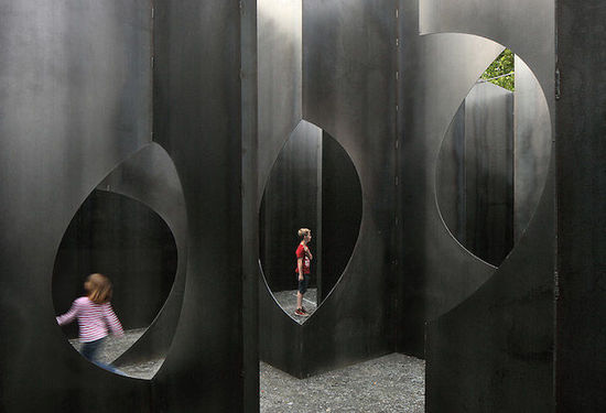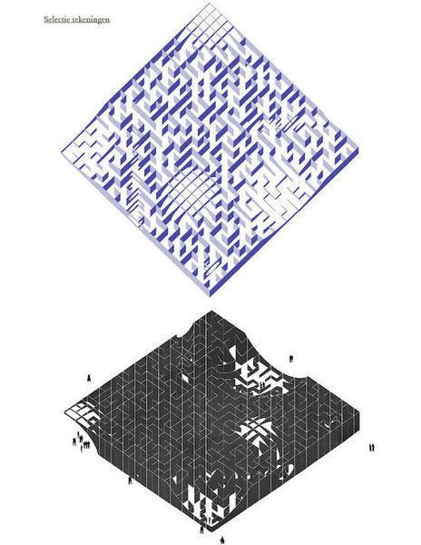 这个迷宫是比利时年轻建筑师 Gijs Van Vaerenbergh 和艺术家 Pieterjan Gijs 共同设计完成的。GijsVan Vaerenbergh 曾做过不少装置,比如下图中这个巨大的几何雕塑。