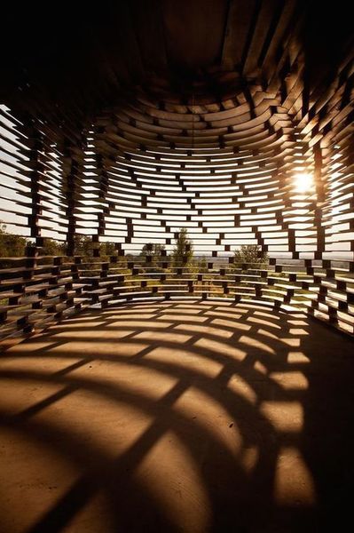 以及下图中用钢片搭建成的、高达 10 米的光影教堂,这座教堂共有 100 层钢板,可以透进光影。