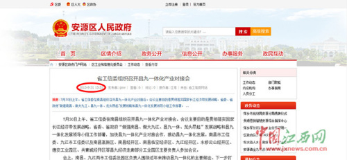 当天下午16时许,中国江西网记者登陆安源区人民政府网站看到,在首页“部门工作”栏目中挂有一篇名为《省工信委组织召开昌九一体化产业对接会》的文章。文章日期显示,发布时间为“2015-8-31 15:53”,文章来自省工信委网站。