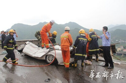 据网友爆料称,8月9日下午2时许,位于四川广元市朝天区的明月峡收费站处,一辆货运罐车逆向行驶撞上一辆小轿车,将小轿车压扁后冲出护栏,将一栋民房部分墙体撞跨,随即坠下悬崖。事故导致小轿车上3人当场死亡,水泥罐车驾驶员重伤,一处民房受损。