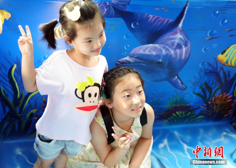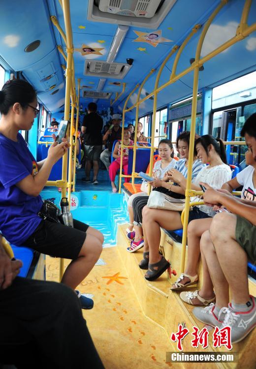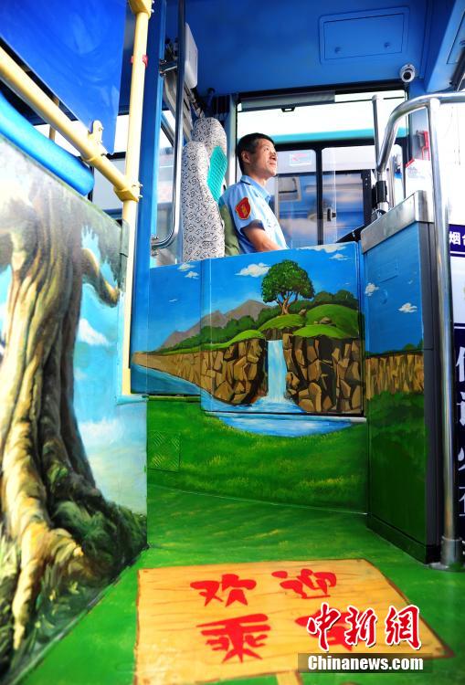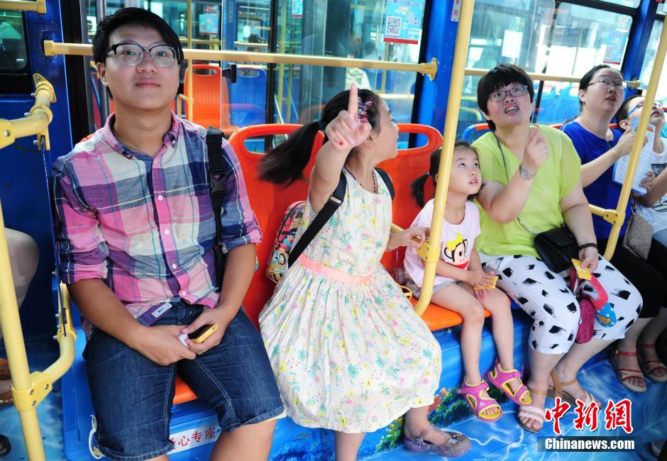 8月 23日上午,6辆3D手绘公交车在山东烟台试运行,以往单调的公交车厢变成了立体的“水族馆”等,前来体验的乘客仿佛在海洋世界等场景里穿行。这6辆3D公交车分别为“文明号”、“烟台山号”、“海洋号”、“养马岛号”、“昆嵛山号”、“蓬莱阁号”,由烟台公交集团聘请专业团队制作。(王娇妮 摄)