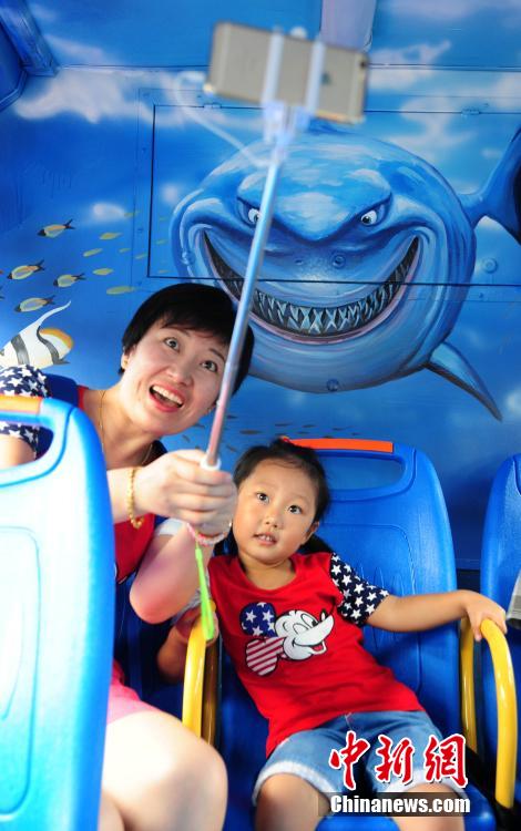 乘客在3D手绘公交车内自拍。 王娇妮 摄