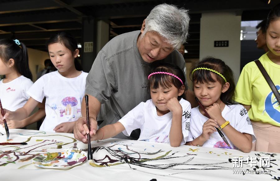 8月29日,著名书法家乔平与来自粤北山区的留守儿童一起作画。