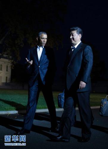 9月24日,国家主席习近平在华盛顿出席美国总统奥巴马举行的私人晚宴。这是习近平和奥巴马从白宫步行前往举行晚宴的国宾馆。新华社记者 李学仁 摄 图片来源:新华网