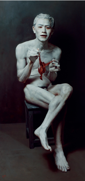 石冲创作中的现代观念,源自其作品中隐藏的隐喻性的东西,通常大家会将其归为超写实艺术,但作品中的装置的、摄影的观念性才是艺术家表现的主题。将于嘉德夜场现身的《欣慰中的青年人》中,人物从头到脚灌注乳白色液体,手拿一只被拔去羽毛的鸟类,面部露出一股尴尬的笑容,画面对象呈现出的这种陌生感和距离感,转换了油画的传统观念,以鲜明的形象符号表达了艺术家对人类生存状态的强烈关注。据悉,此件拍品曾于2007年以1131.2万元拍出,近10年后再次现身于市场,令人期待,据悉本件作品为估价待询。