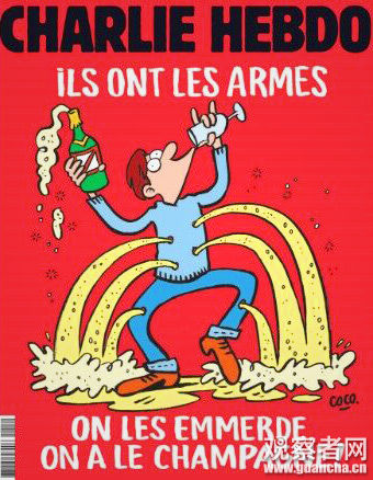 《查理周刊》在社交媒体提前公布了最新一期杂志封面,鲜红的底色上,一名男子右手拿香槟左手举杯,正在痛饮。但是他全身却有好几个枪眼,喝进去的酒从中流出,溅了满地。在男子的上方写着一句:“他们有武器!”。下方则是“去他X的,我们有香槟!”