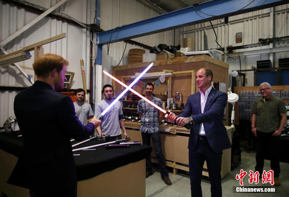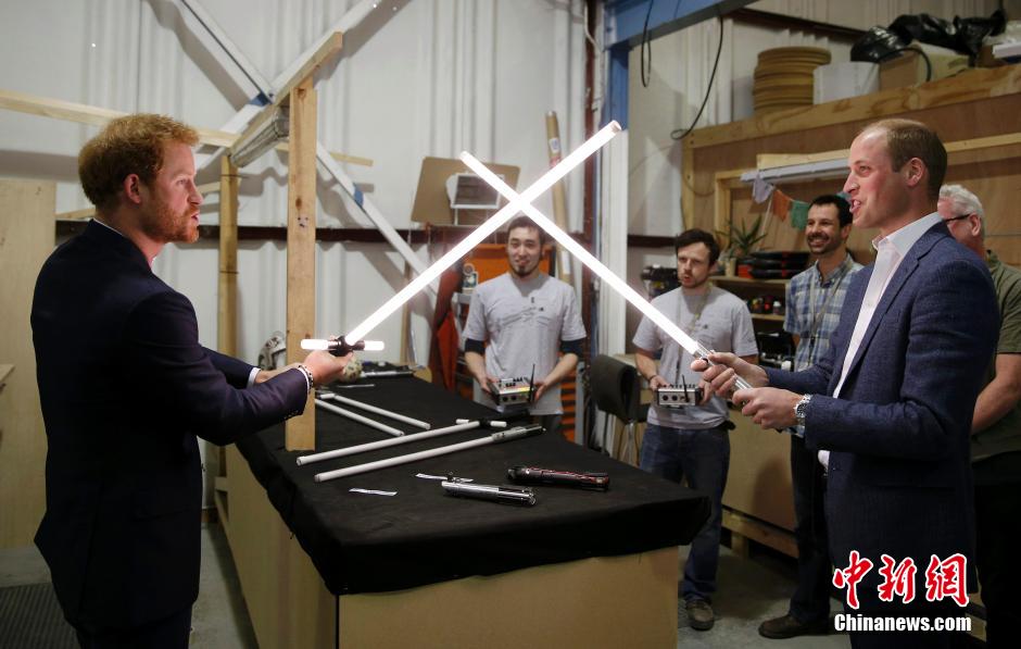 当地时间2016年4月19日,英国伦敦,威廉王子和哈里王子访问松林制片厂,参观电影《星球大战》拍摄地和电影幕后的创意团队工作。兄弟俩对光剑产生浓厚兴趣,童心未泯的“对打起来“。