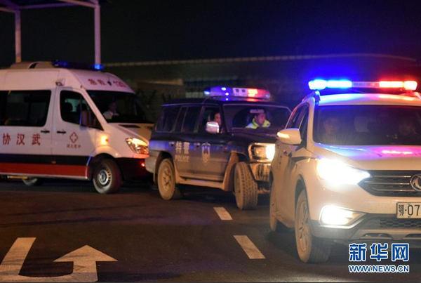 5月8日20时30分,来自武汉协和医院的救护车在机场警车的引导下,通过安检驶入停机坪。