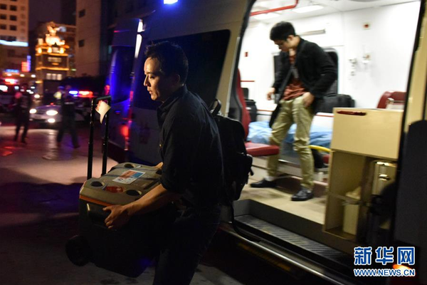5月8日21点01分,武汉协和医院的救护车到达医院,工作人员将器官转运箱搬下救护车。