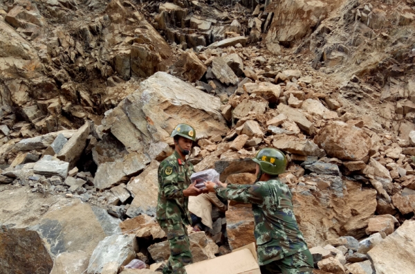 7月14日,武警交通二支队一大队的救援人员在现场进行灾情勘察。