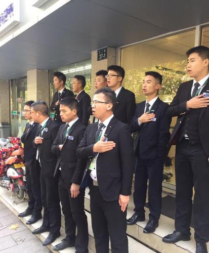 10来个中介业务员在店门口的台阶上站成两排,开始唱“司歌”。