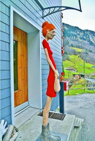 利用自己家乡瑞士乌里州山谷的椴树、落叶松创作雕塑,是艺术家彼得·赫兹比道恩的生存之道,也是他爱护、宣传家乡的最好方式。现在,他的作品远销北美,并被广泛收藏。图为彼得工作室门外具有他鲜明风格的雕塑作品。(何农 摄)