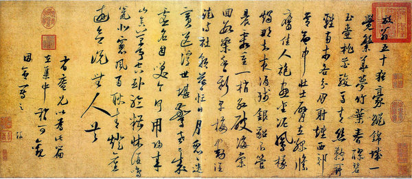 草书与酒似乎有不解之缘,擅草者往往善饮,甚至既是“草圣”也是“酒仙”。杜甫曾作《饮中八仙歌》, “草圣”张旭就位列其中,他每次大醉以后,呼叫狂奔而后下笔,草书越发奇绝;甚至在大醉之后,“以头濡墨而书,既醒视之,自以为神,不可复得也。”怀素更 是一位狂僧,毫不在乎佛教禁酒戒令,据说每日都要大醉几回。他嗜酒养性,也以狂草畅志,“醉来信手三两行,醒后却书书不得”。