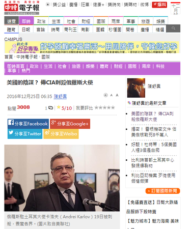 《中时电子报》称,俄罗斯驻土耳其大使安德烈·卡尔洛夫19日被刺杀后,震惊各界,而最近更有许多土耳其媒体将矛头指向美国,认为是美国中央情报局(CIA)和欧美同盟策划暗杀,目的是要破坏土耳其和俄罗斯关系。