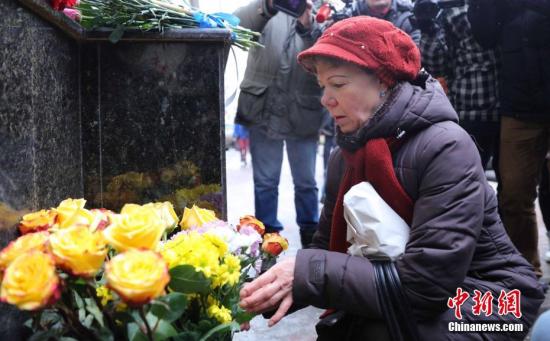 当地时间12月25日,俄罗斯民众在亚历山德罗夫红旗歌舞团门口为图—154空难遇难者献花。中新社记者 王修君 摄