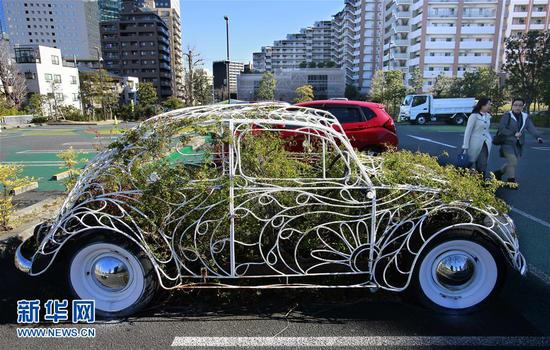 1月17日,在日本川崎,行人从一个汽车形状的艺术装置旁经过。