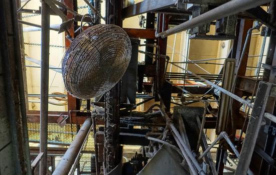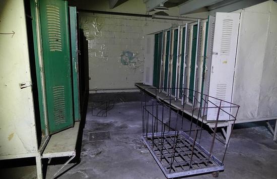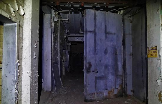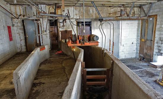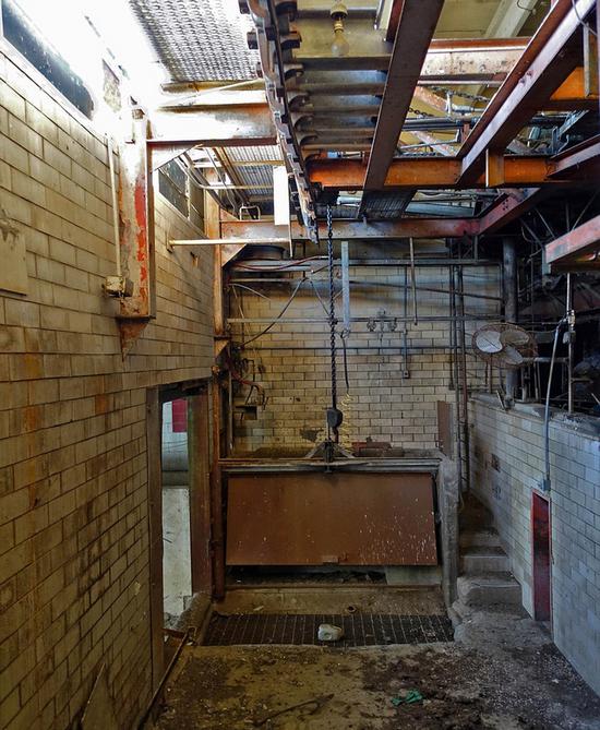 吉姆猜这里曾经的工作氛围一定很压抑,工人们要时刻提防感染和受伤。深入工厂内部,裸露的砖石混凝土墙上缠绕着各种管道、电线和重型机器,上面也落满了尘埃、污垢和蛛网。待宰牛群生命的尽头是一方混凝土池,池子的另一头是一个陷阱,等着被流水线运来的牛群。旁边一个写着“禁止入内”的房间里布满了齿轮、皮带轮和枷锁,牛群会被吊在这里等待肢解,地面上蜿蜒着用于排除血污的沟槽,可见这里的工作环境多么糟糕。地下室的情况则更加恶劣,光线昏暗,死水一片。