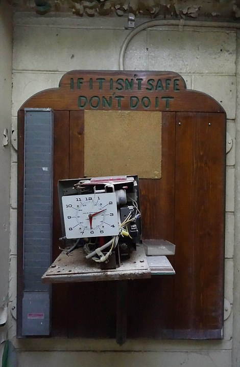 吉姆摄影的取景地是一座位于内布拉斯加州的废弃屠宰场,这里曾经屠宰过成千上万头牛,充斥着锈迹斑斑的机器遗骸。现在,整座工厂已经衰败了,入口的时钟孤零零地竖着,上方悬挂的告示牌写着“如遇危险,停止操作”。
