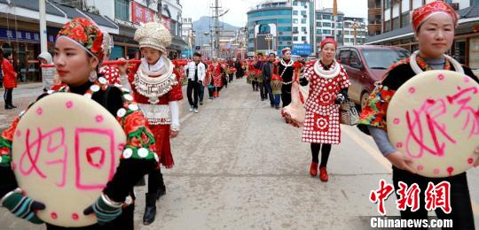 “姑妈”在苗语里是对已婚女子的统称。县城的南门社区大门前,4位“姑妈”手持大粑粑领队,其余肩挑水果、鸡鸭、稻鱼、猪肉、瓜果、辣椒及美酒等各式礼品。每年新春,“姑妈”们都以这样隆重的传统礼俗,带领子女回乡探亲拜年。